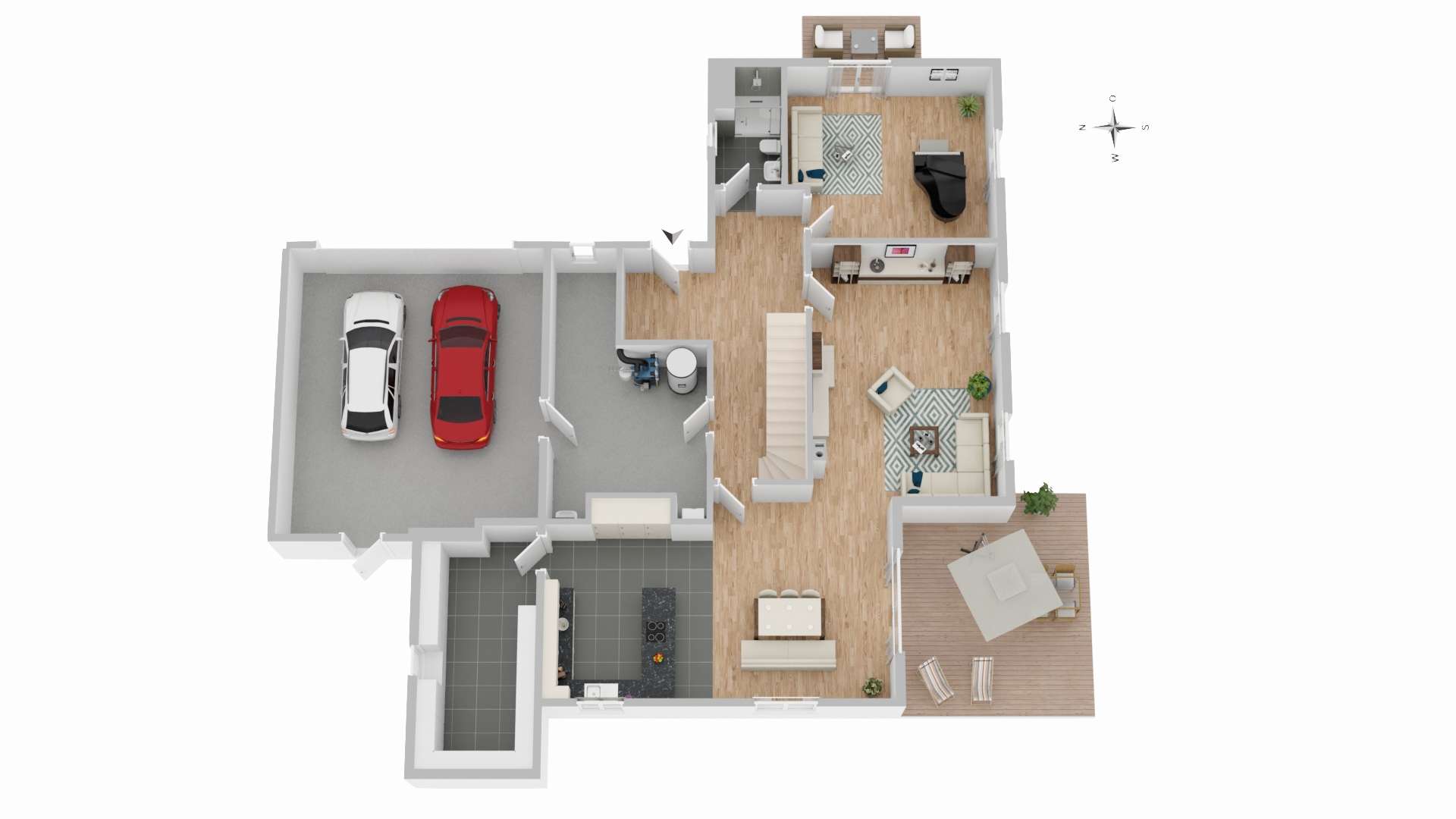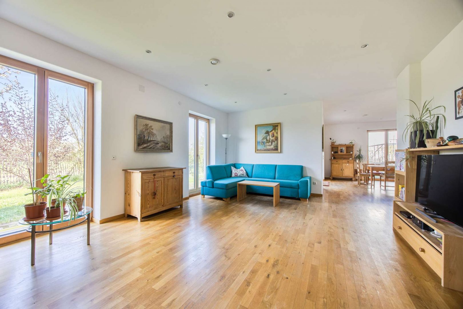 Für Fahrzeuge steht eine geräumige Doppelgarage zur Verfügung. Zukunftssicher und nachhaltig präsentiert sich das Haus auch in energetischer Hinsicht: Eine moderne Wärmepumpe in Kombination mit Erdwärme sorgt für ein angenehmes Raumklima bei gleichzeitig niedrigen Betriebskosten.